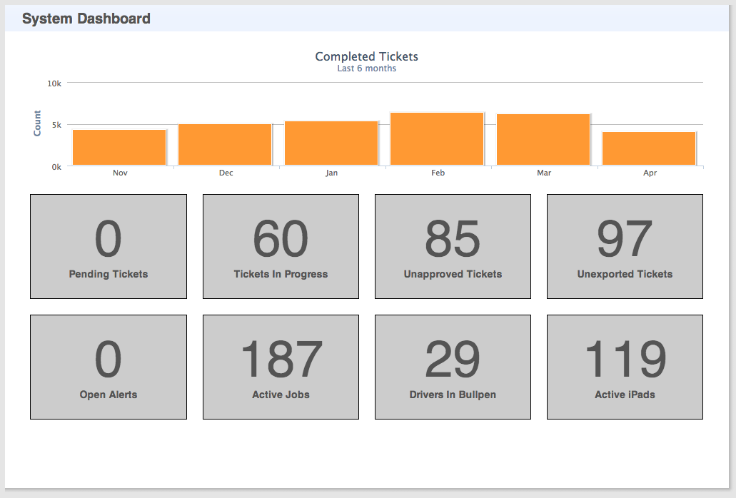 Asset Vision makes it easy to see view your company's ticket status. For example, the system dashboard shows key metrics such as the number of tickets in progress, the count of tickets that need to be approved, and the number of drivers who are waiting to be assigned work (Drivers in Bullpen).