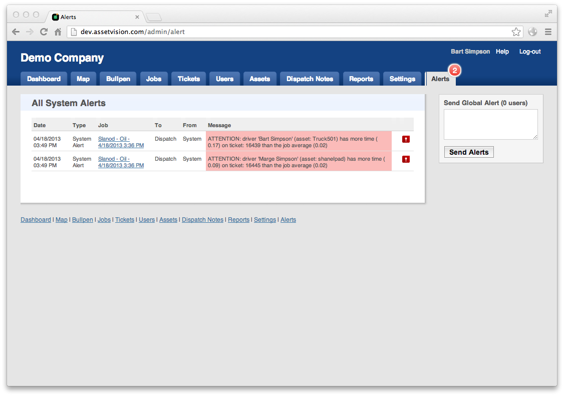 Asset Vision allows dispatchers to communicate with drivers either through the mobile application or via SMS (cellular text messages). In addition to driver communications, the Asset Vision server is constantly monitoring the system for situations that could mean ticket problems. For example, if a driver starts a ticket but does not move their truck for a while then the system reports this to dispatch as an alert to check on. Other items that are monitored include long ticket times, driver loads / unloads at a location other than what was assigned, and problems with the driver mobile application.